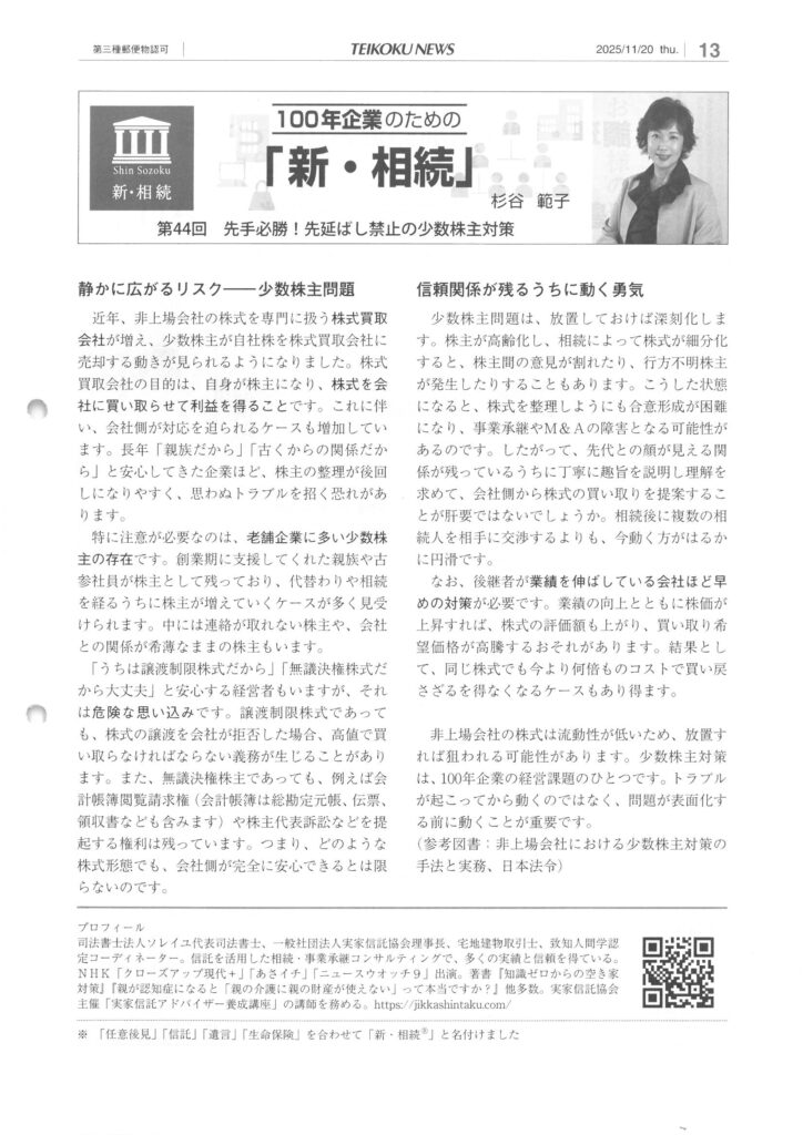 帝国データバンクが発刊している冊子『日刊 帝国ニュース』にて、私たちの代表杉谷範子の連載「100年企業のための『新・相続』」にて、「第44回 先手必勝!先延ばし禁止の少数株主対策」というテーマで執筆した記事が掲載されました。