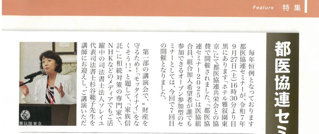 令和7年9月27日に開催された「都医協連セミナー」において、弊社代表の杉谷が登壇し、家族信託をテーマに講演を行いました。